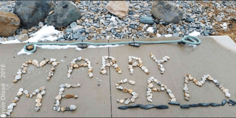 “It was freezing rain at the time and I remember just running around finding as many rocks as fast as I could to spell out my proposal message while the rain was slapping me in the face.”